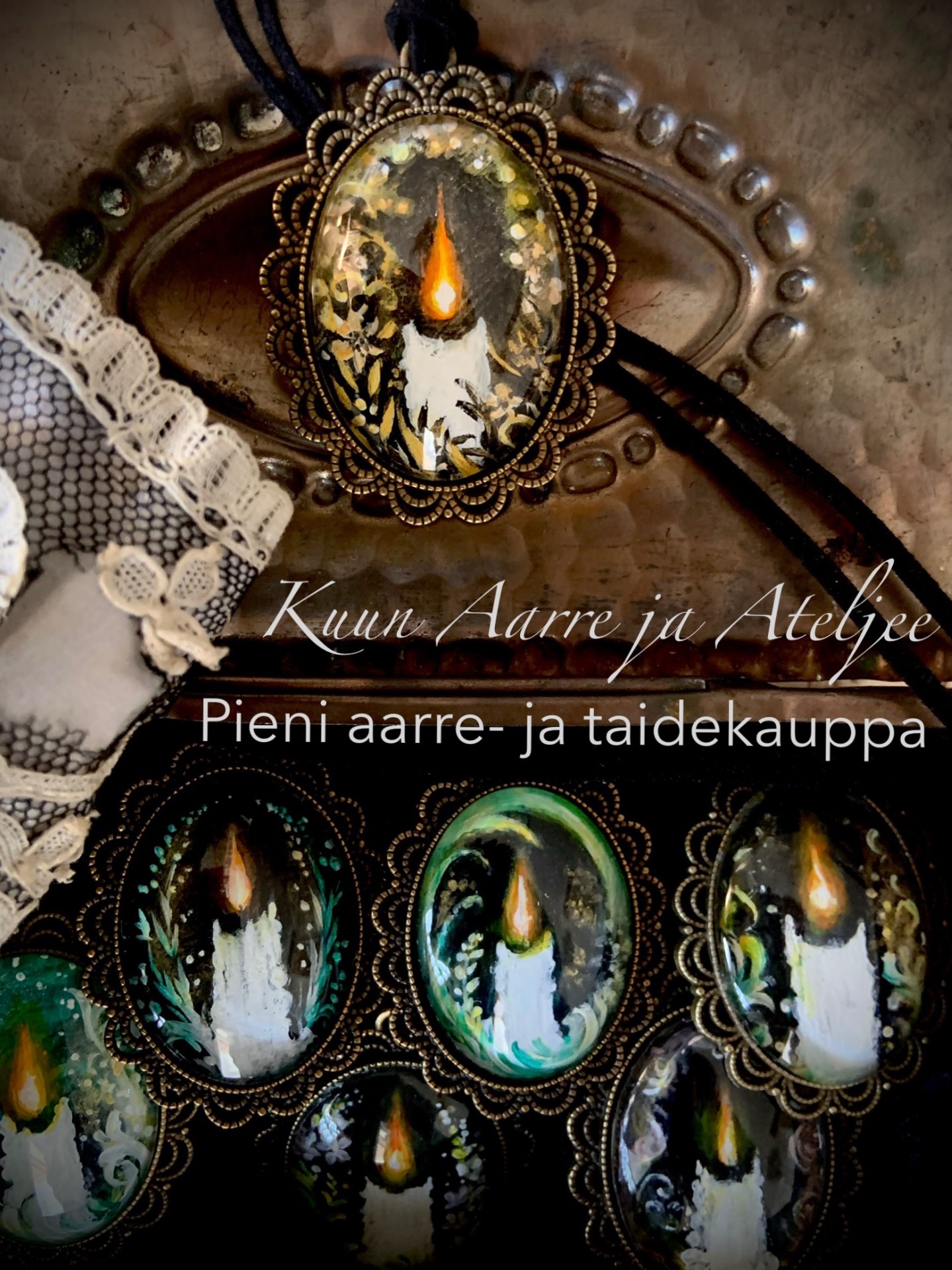 Kuun Aarre ja Ateljee on pieni aarre- ja taidekauppa verkossa. Kaupassa on kaksi pääosastoa: ateljeessa taidetuotteet ja antiikki- ja vintagepuolella vanhat pienesineet. Olet lämpimästi tervetullut seikkailemaan sivuilleni ja tekemään omia aarrelöytöjä!
