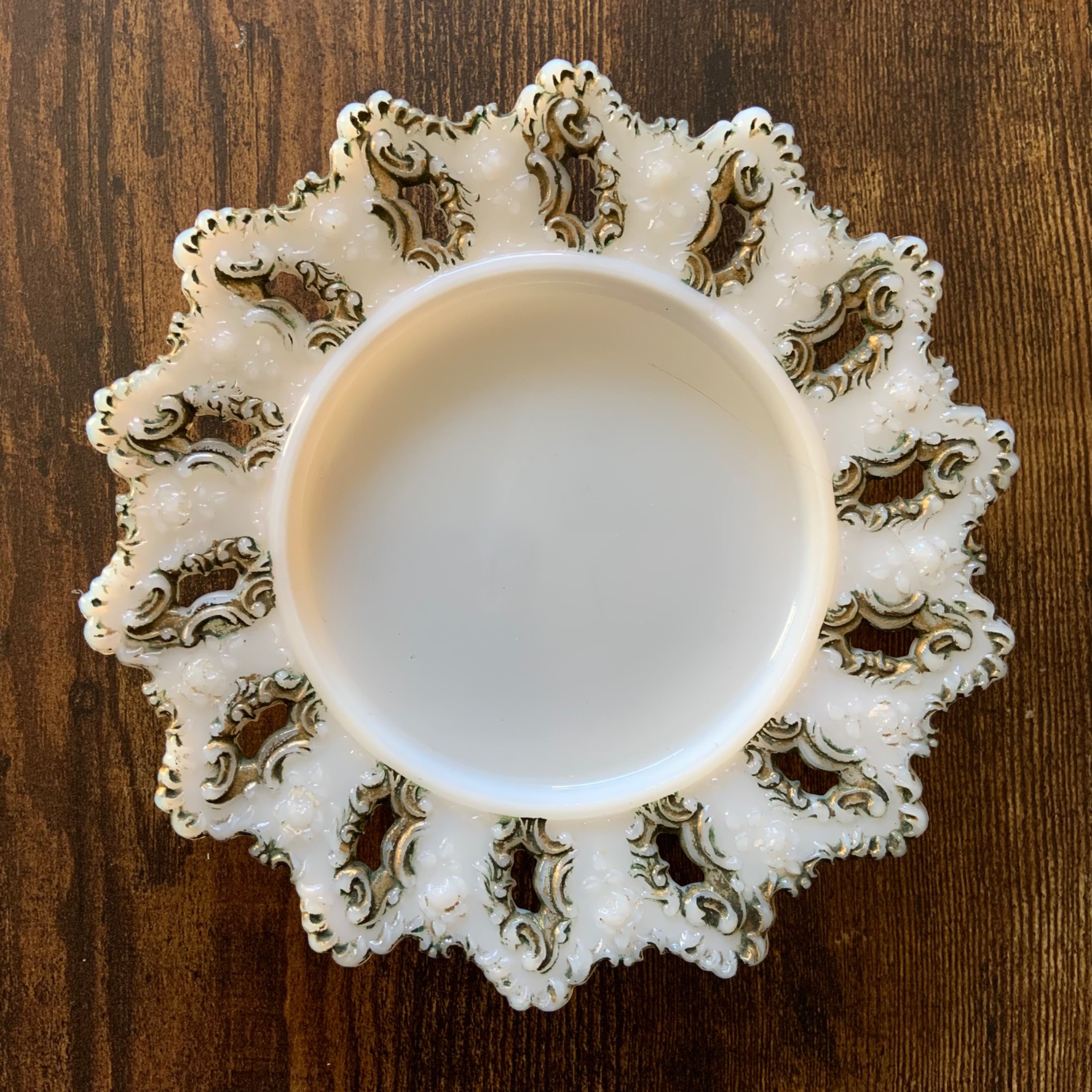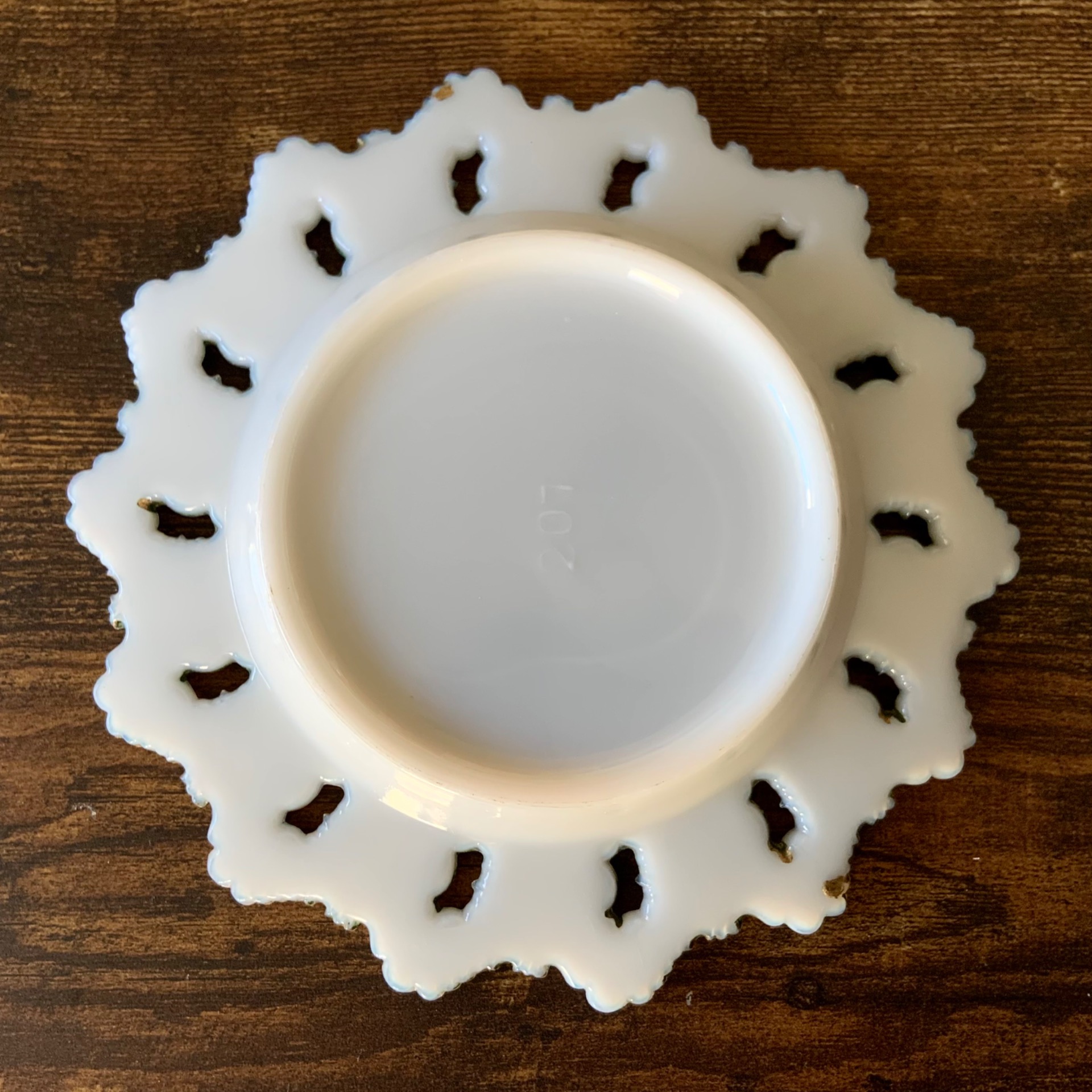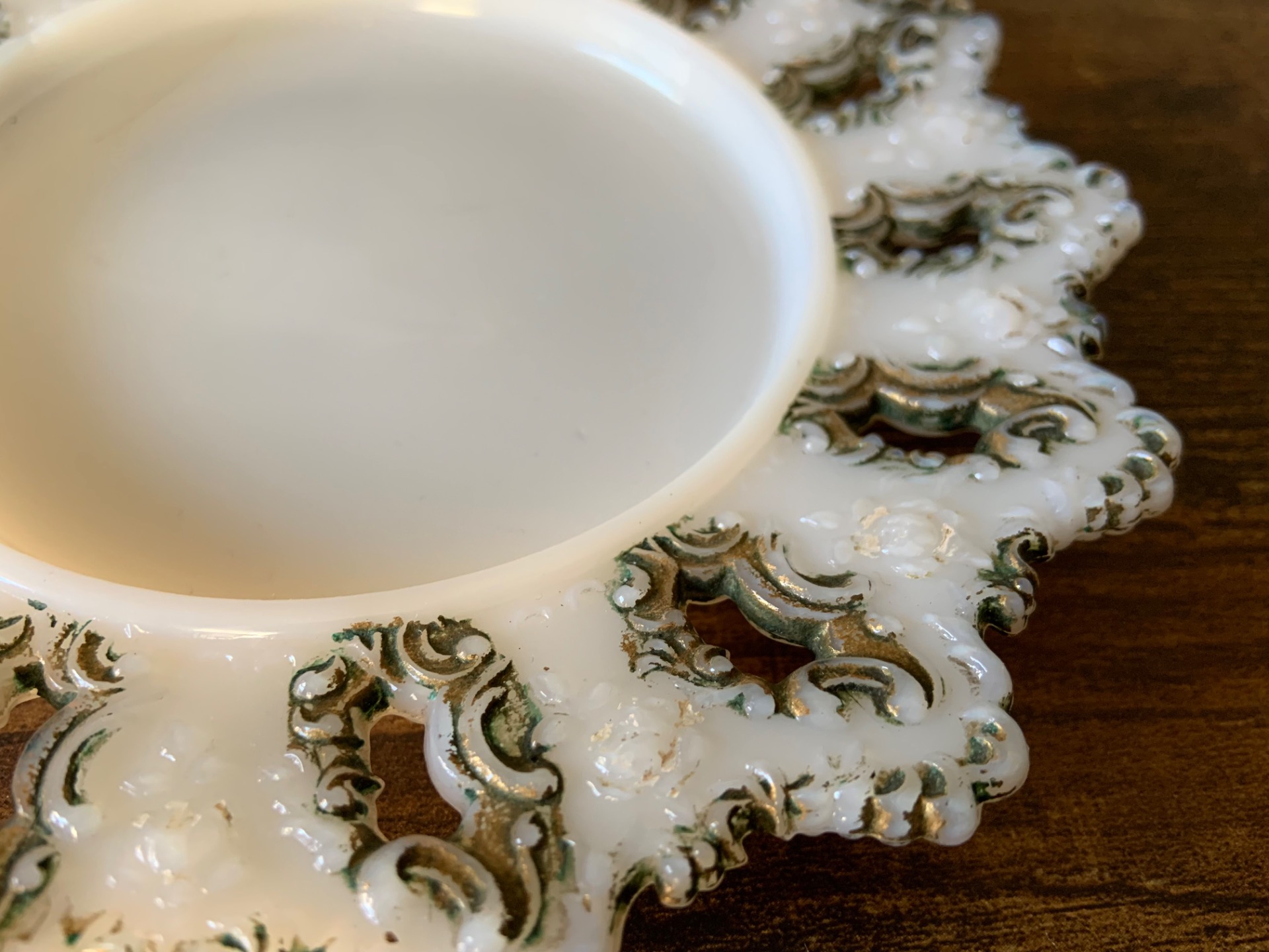 Viktoriaaninen voilautanen valkoista maitolasia. Kultausta, joka osin kulunut.