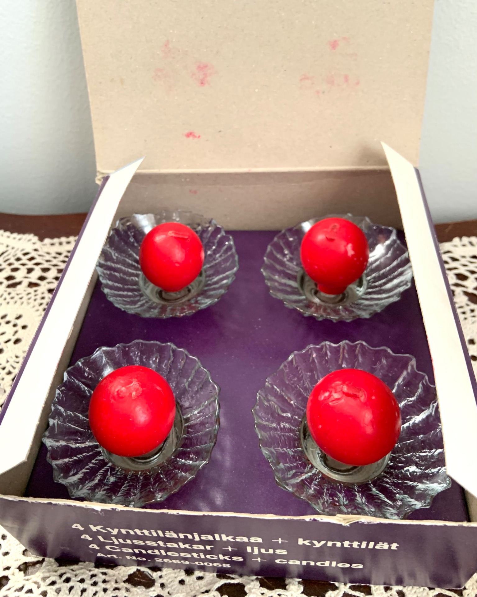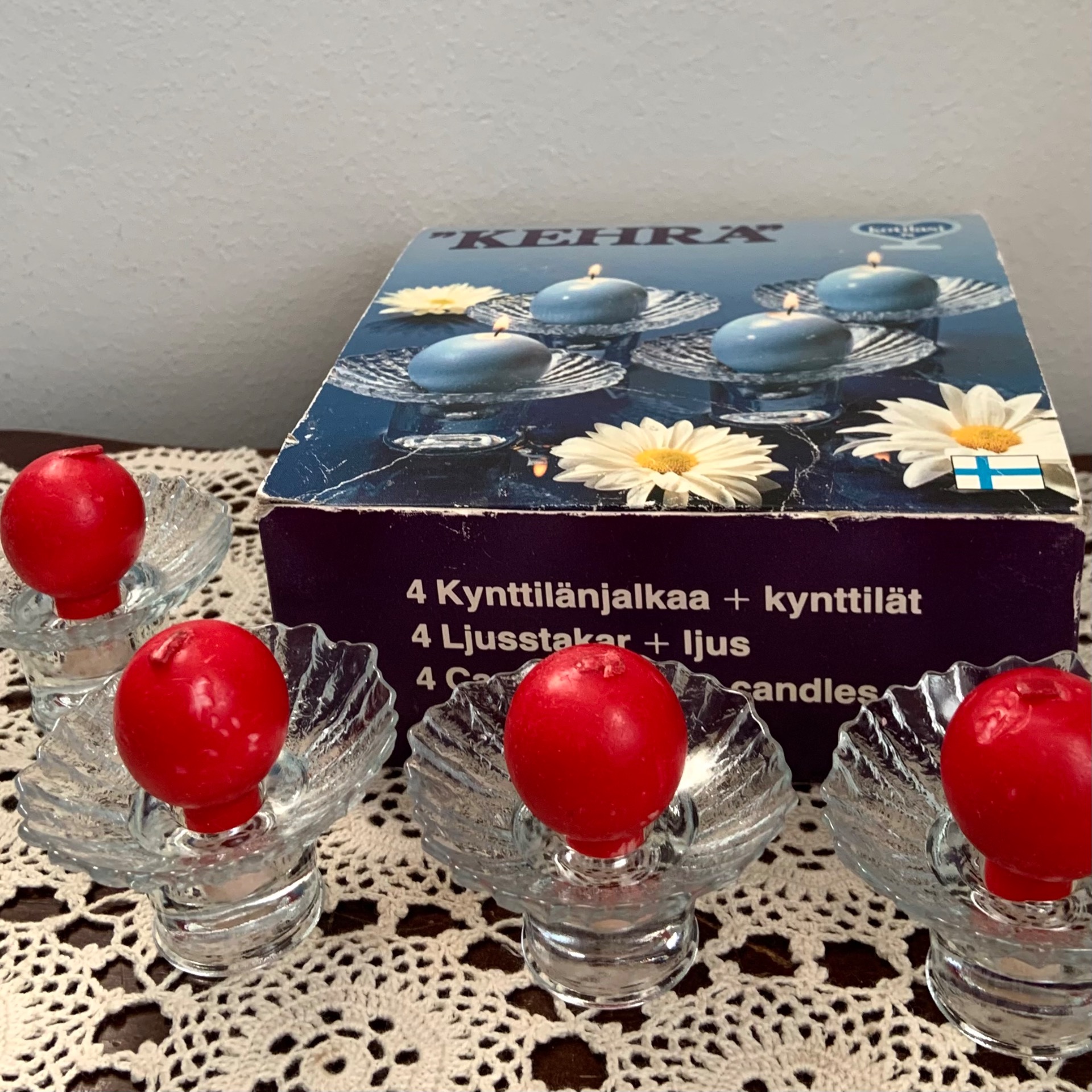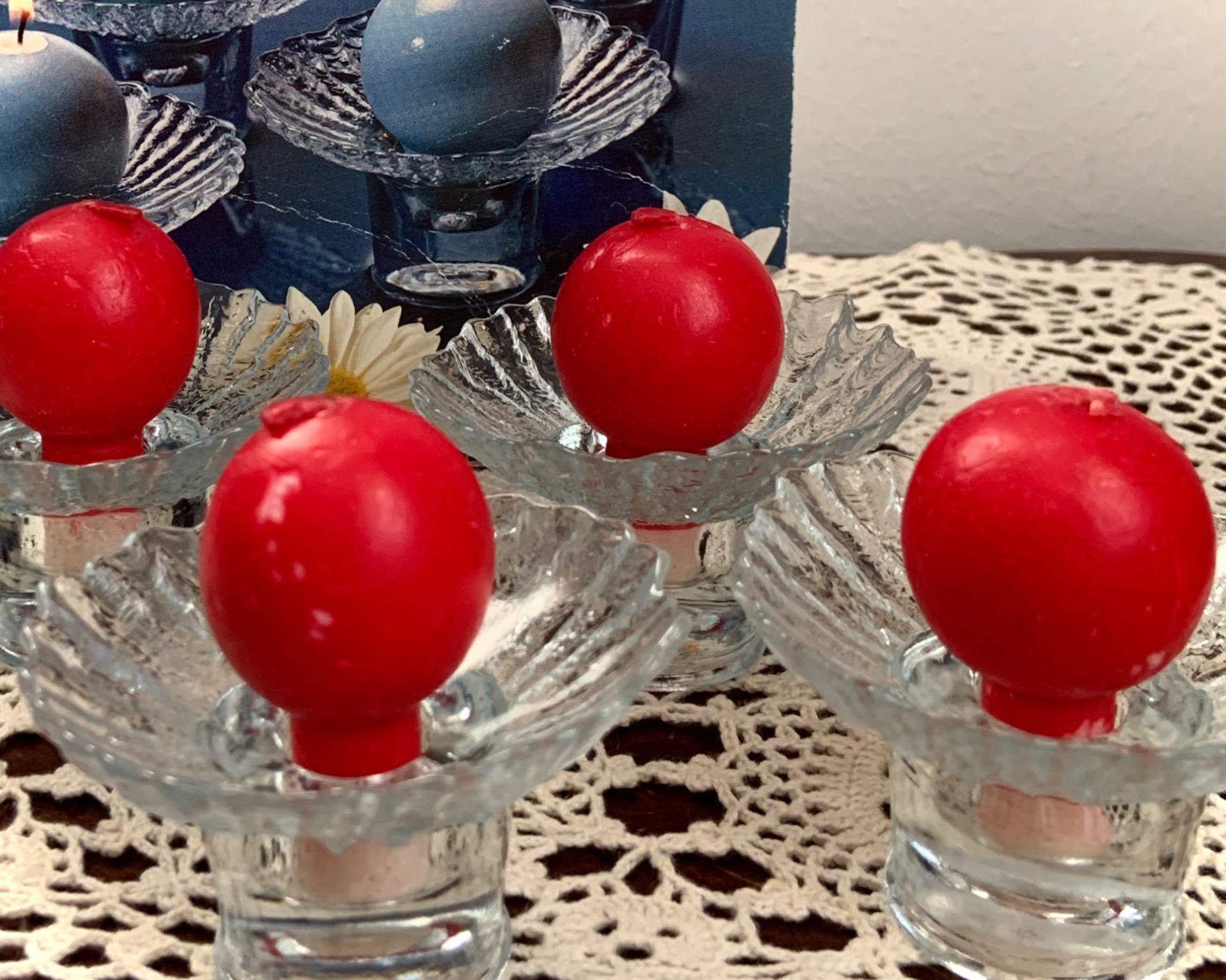 Pienet lasiset kynttilänjalat pallokynttilöillä.