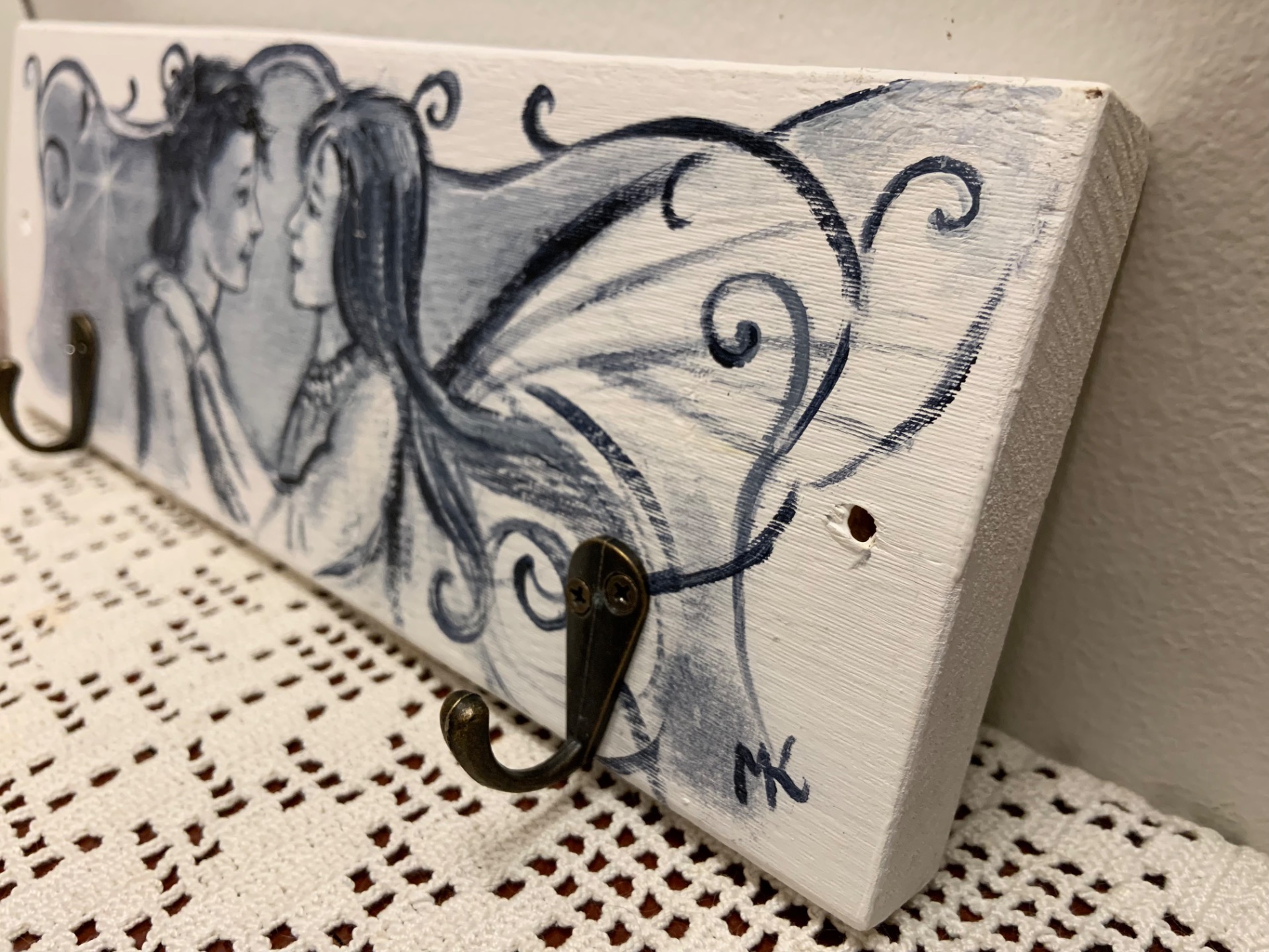 Tumman harmaalla ja valkoisella akryylivärillä maalattu.