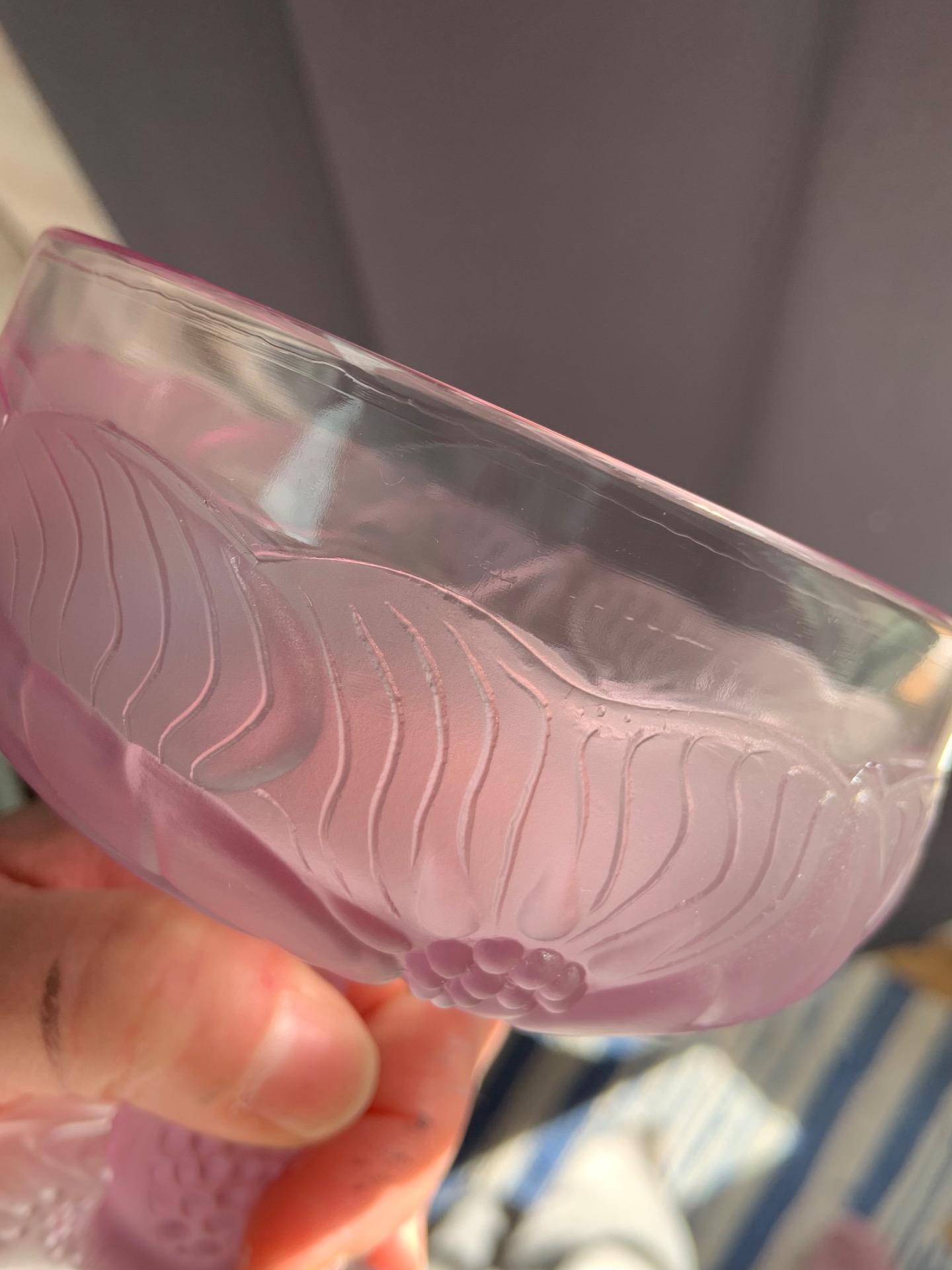 Lilan värinen italialainen puristelasikulho. Alaosa huurrelasia. Puristuslasille ominaisia valmistusjälkiä ja pientä käytönjälkeä. Ohut naarmu näkyy lähikuvassa.