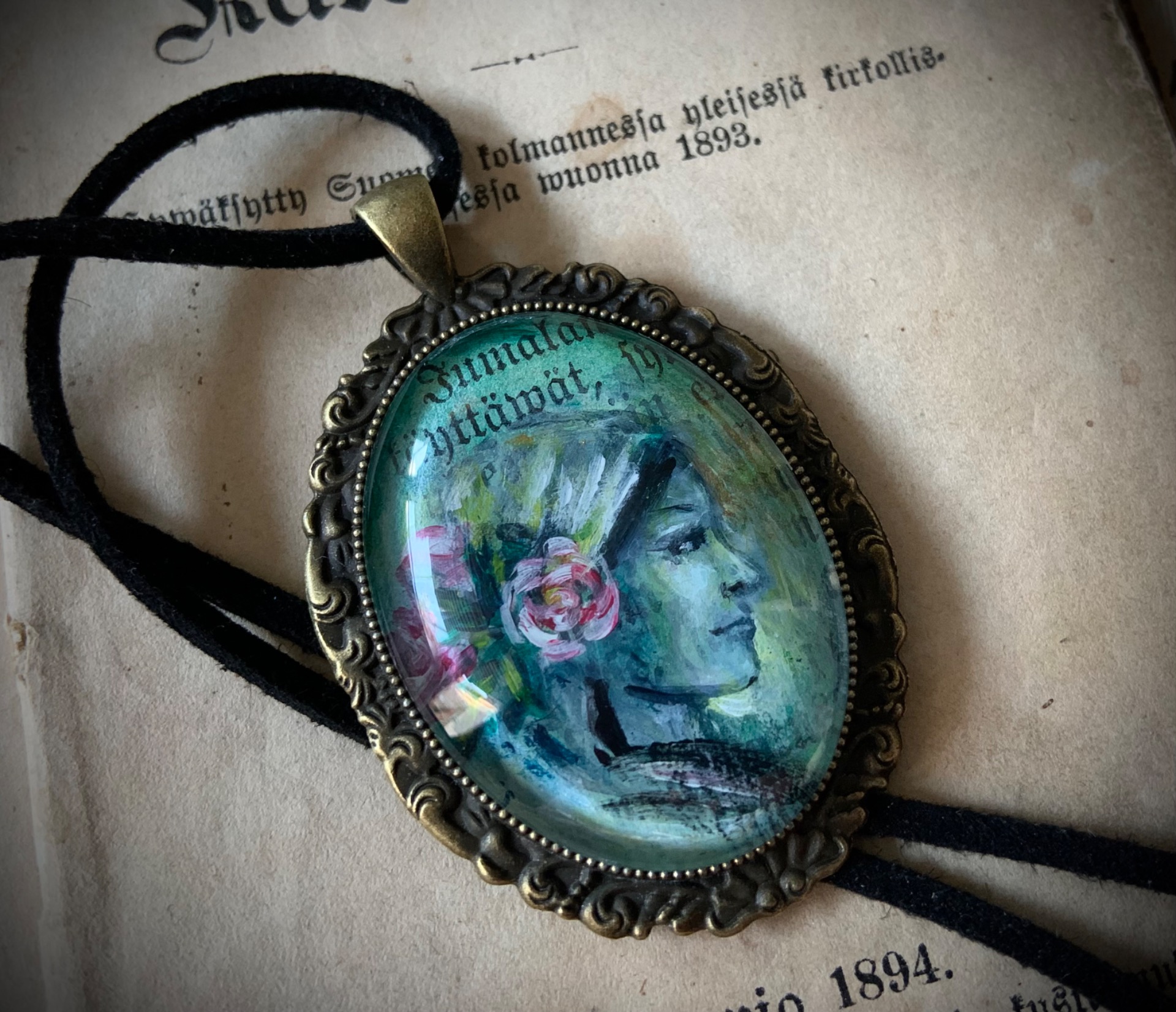 Tässä vihreäsävyisessä korussa yhdistyy rauha, vakaus ja kiitollisuus. Vihreät sävyt korostavat kukkien kanssa luonnonläheisyyttä. Nimesin hänet Metsän neidoksi.