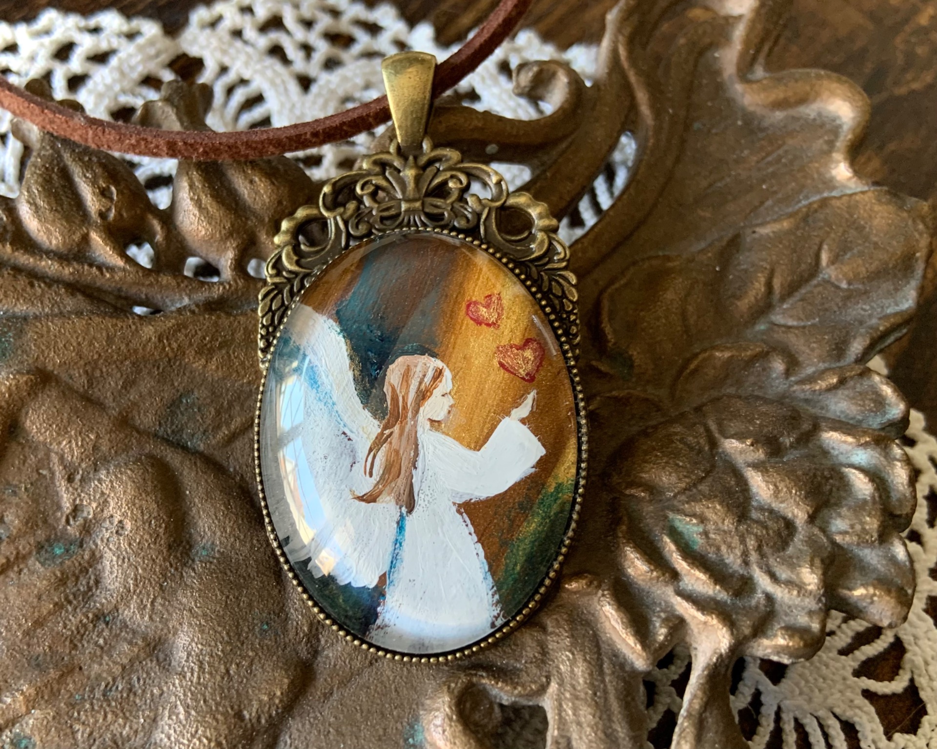 Voimakas, hieno kuparinen hehku enkelin taustalla.
