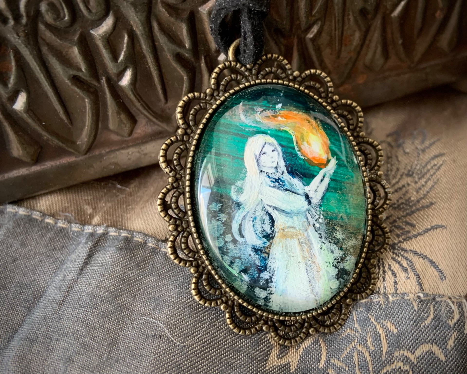 Hienostunut kullanhehku suojelijan vyössä ja tulen reunoilla. Kaunis malakiittimainen vihreä maali taustassa.
