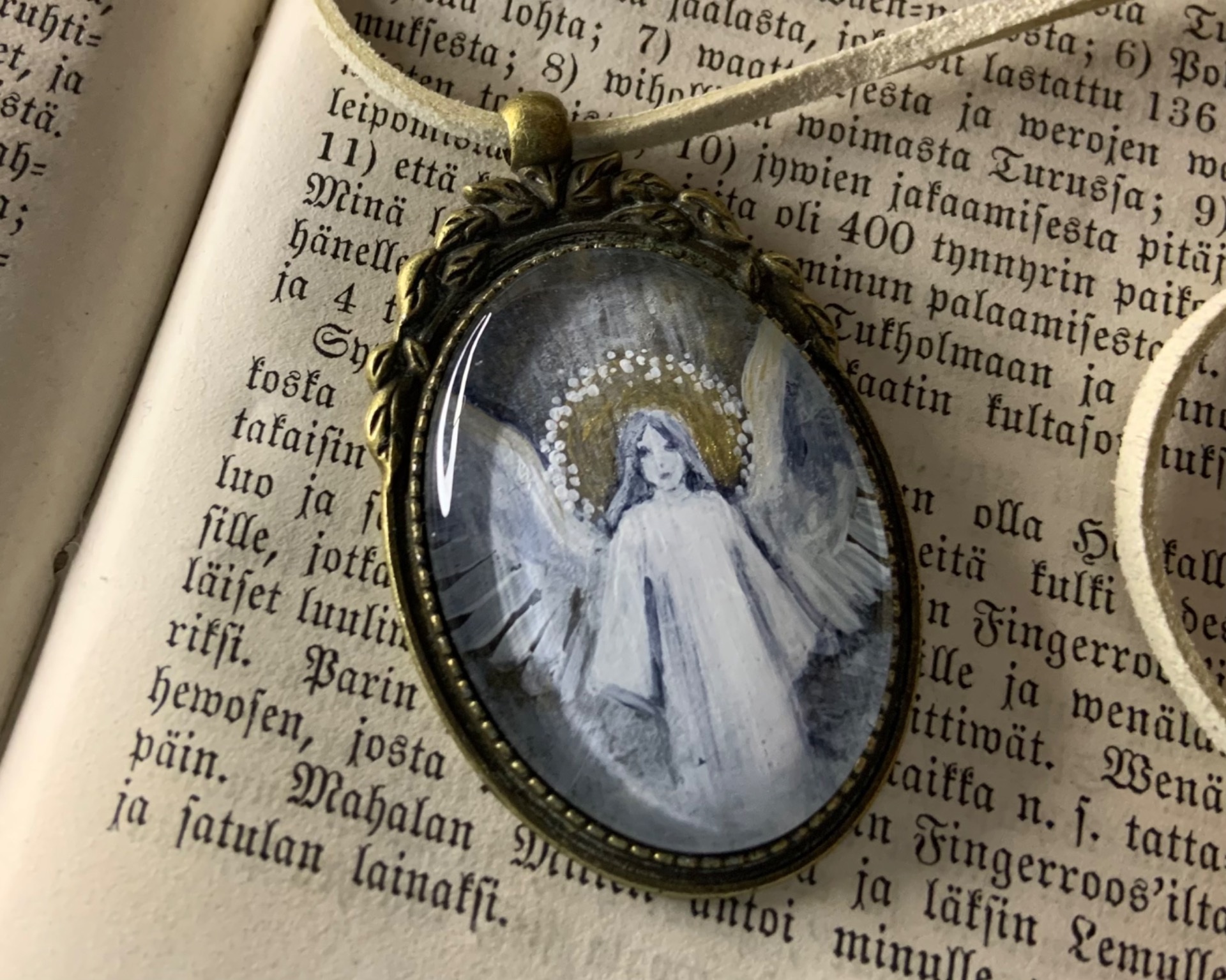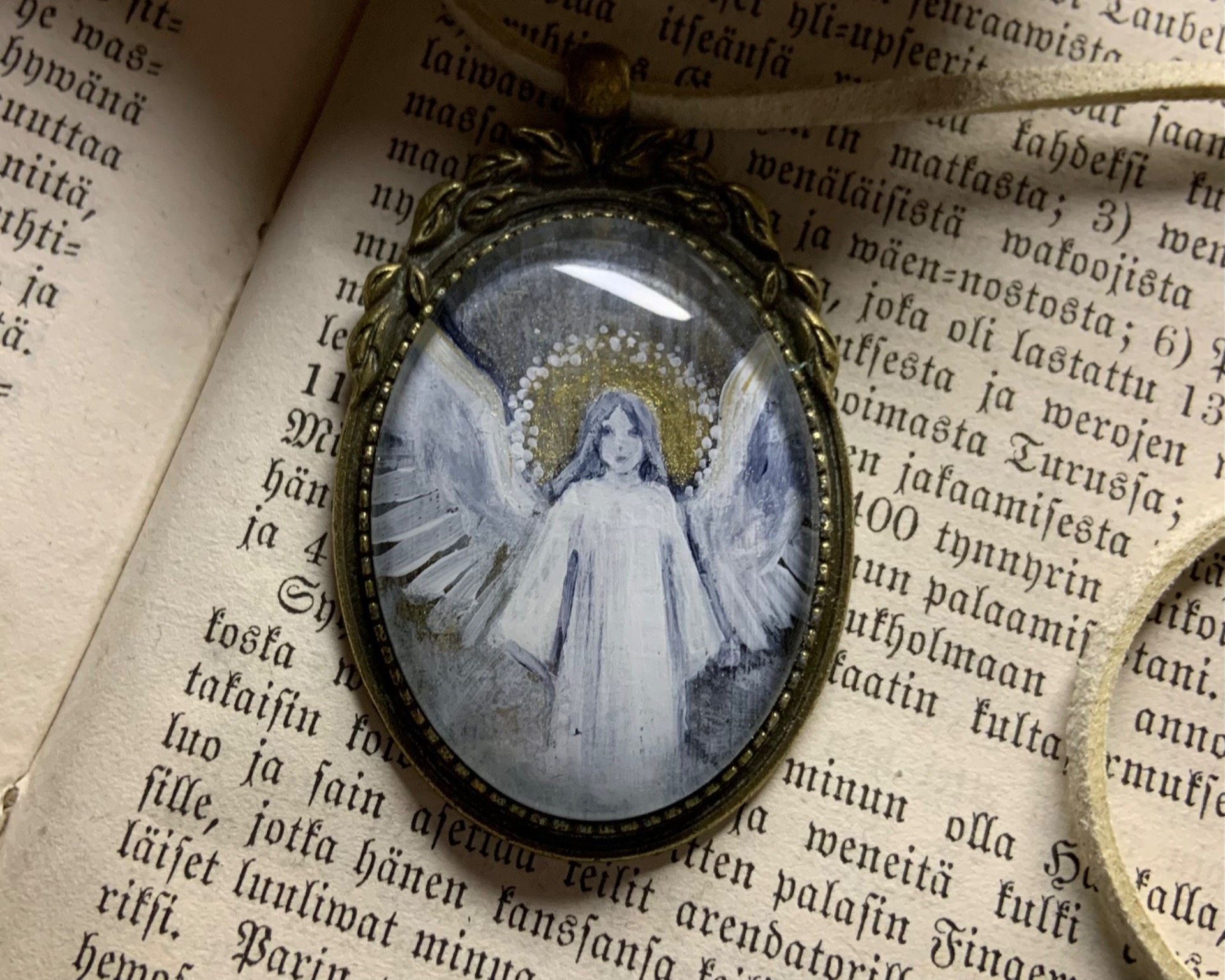 Harmaasävyinen maalaus, jossa enkelin sädekehä loistaa kultaisena. Myös ylhäällä taustassa sekä siipien yläreunoilla upea kullanhehku hyvässä valossa.