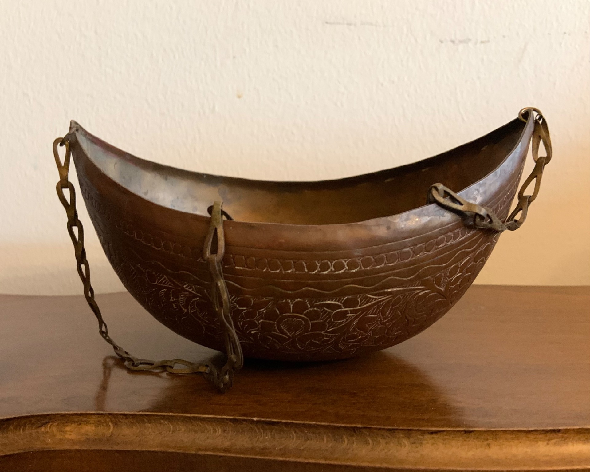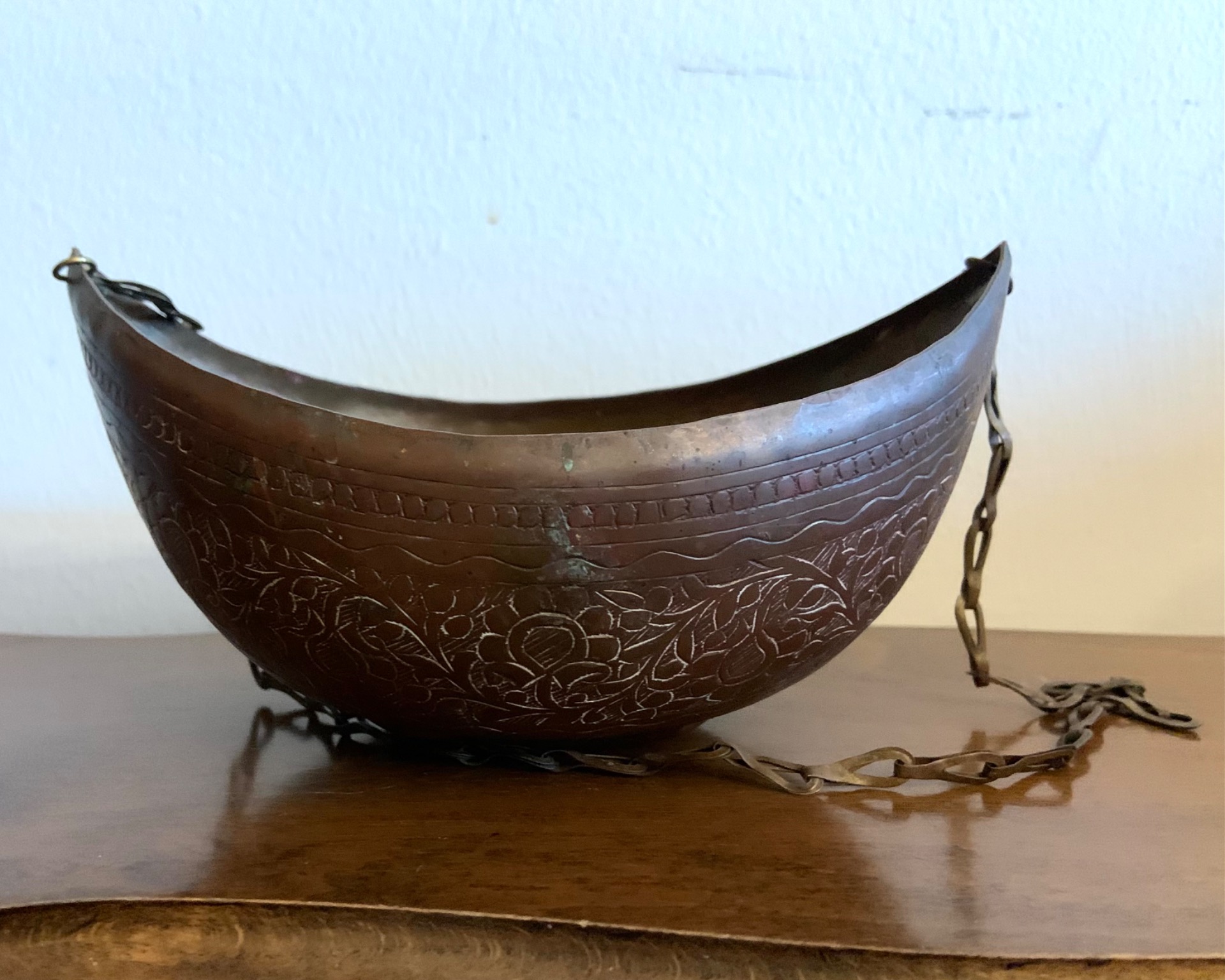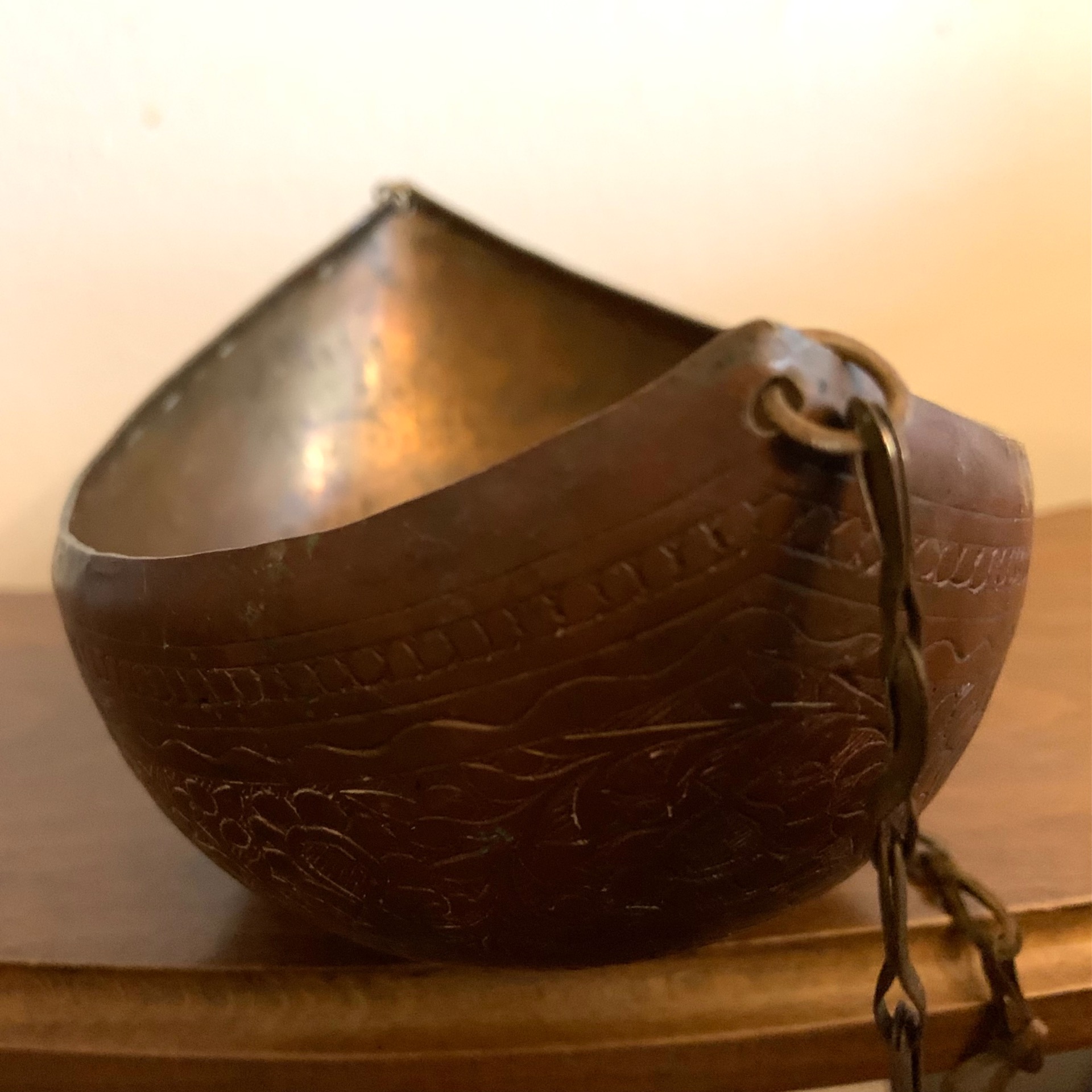 Kaunis kaiverrettu, kuparinen Kashkul-kulho ketjulla. Patinaa ja käytön jälkiä. Ketjun toisen pään liitosrengas uusittu.