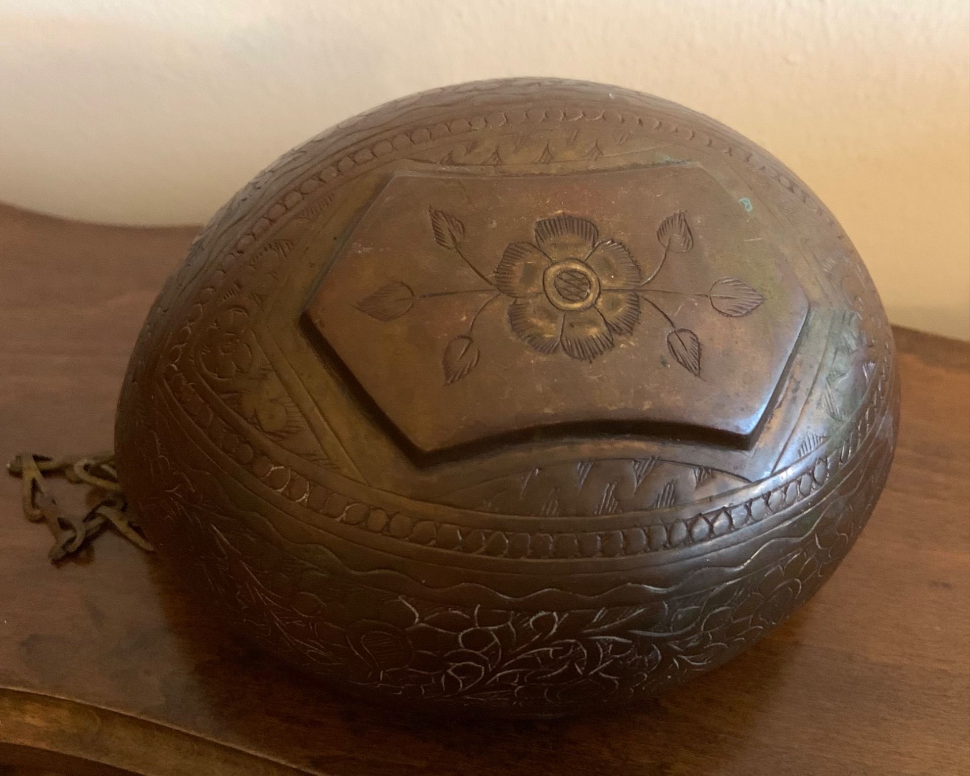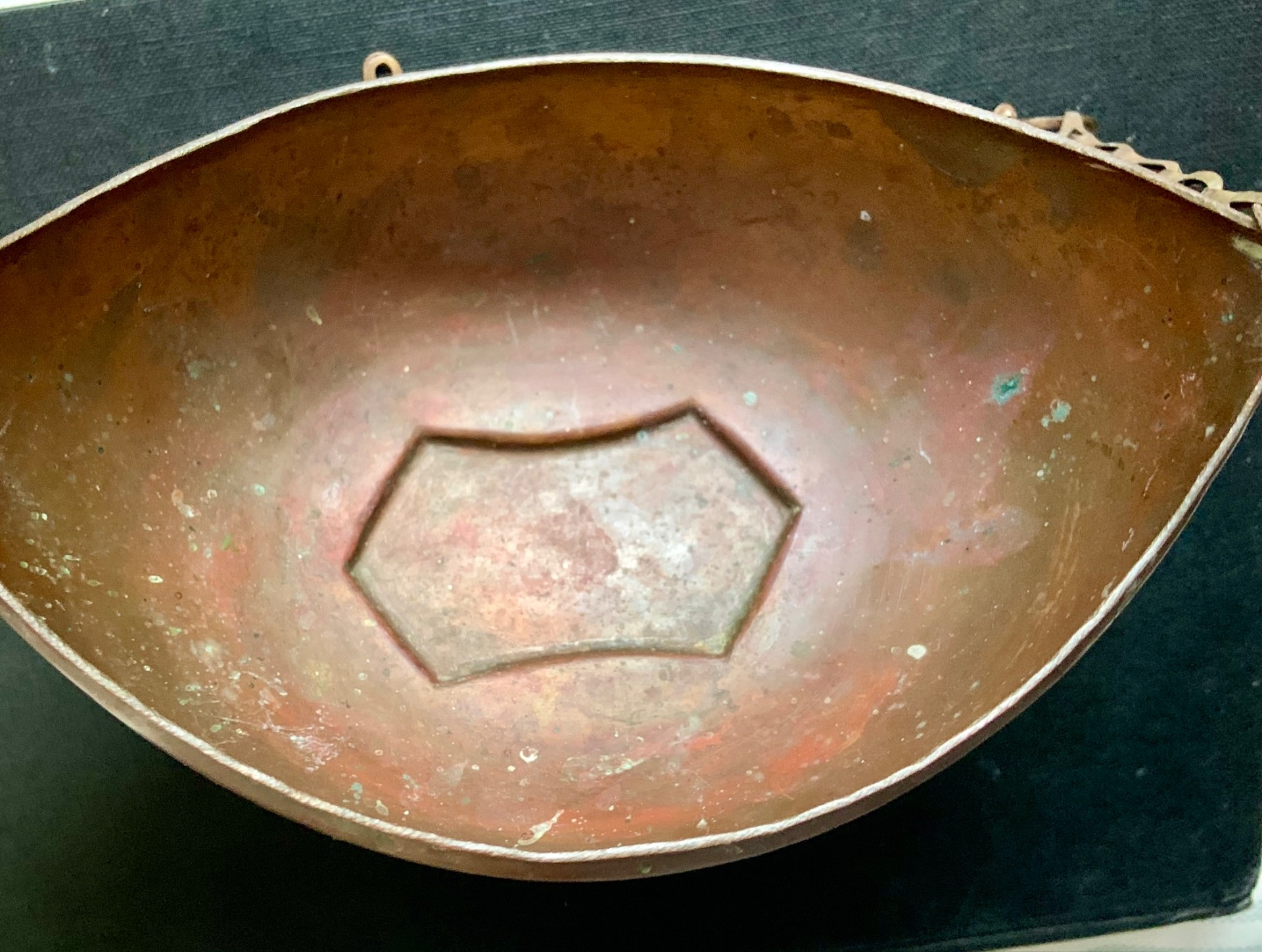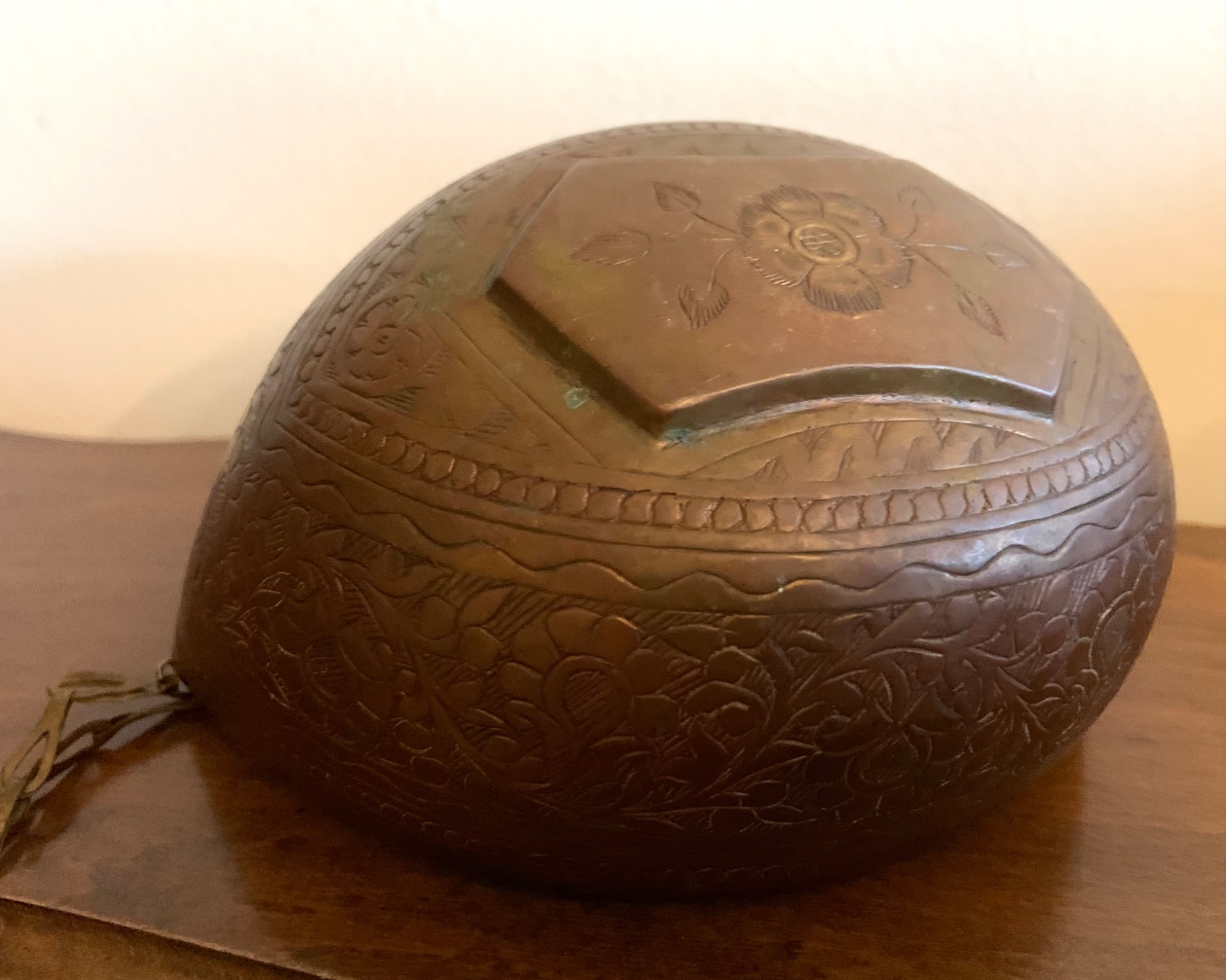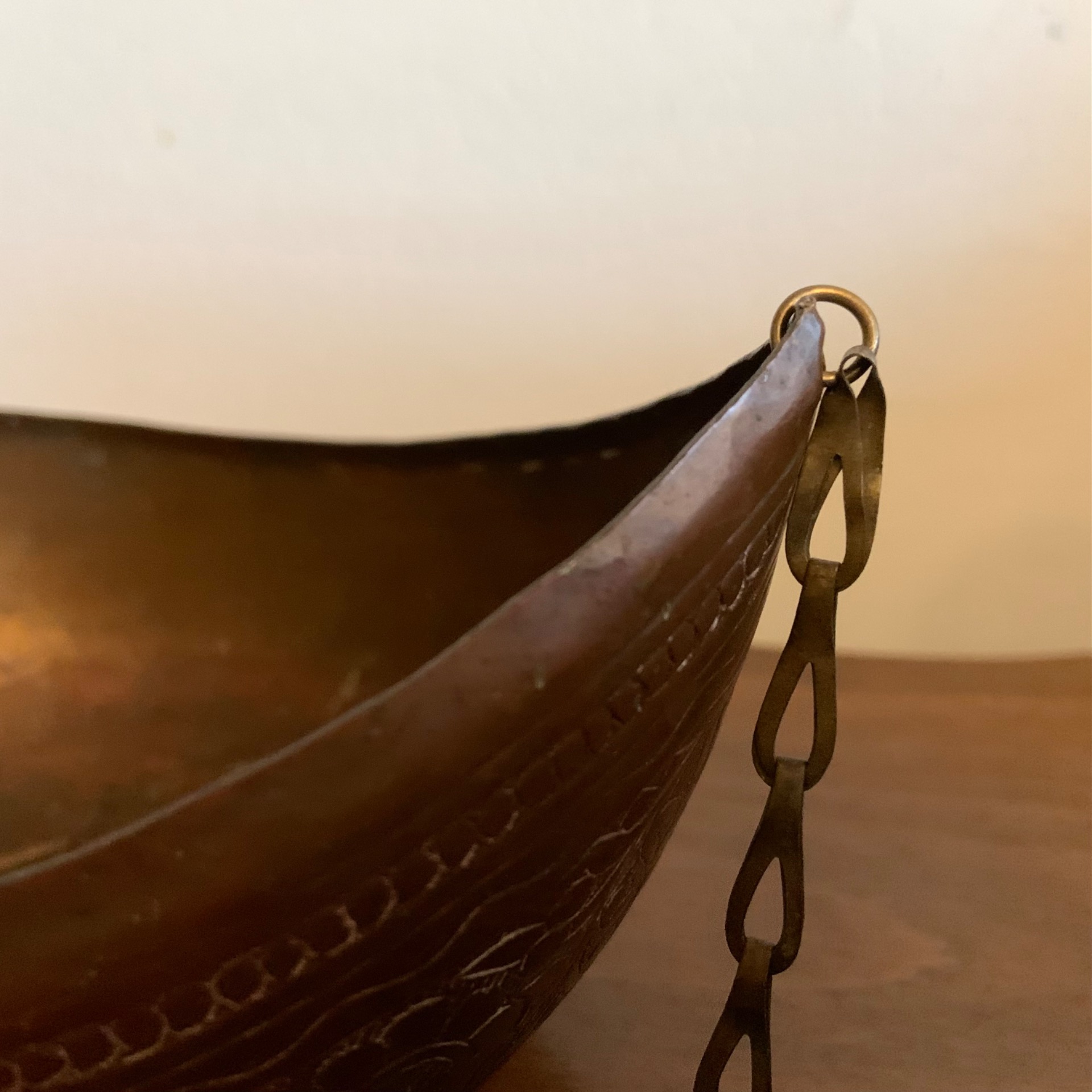 Kaunis kaiverrettu, kuparinen Kashkul-kulho ketjulla. Patinaa ja käytön jälkiä. Ketjun toisen pään liitosrengas uusittu.