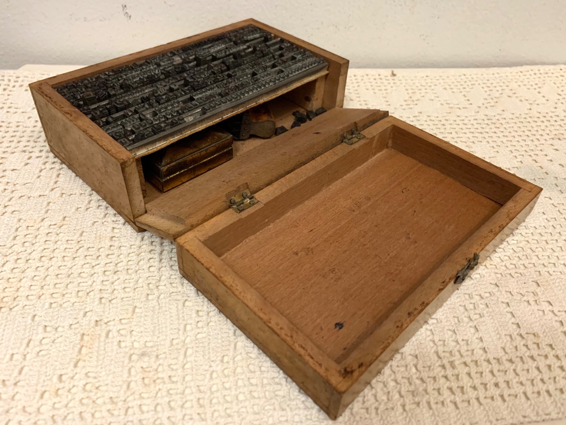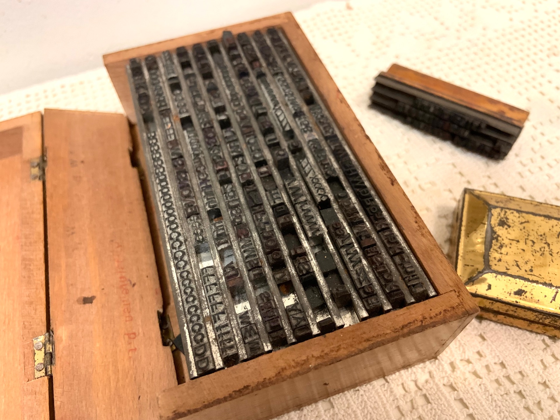Vanha kirjasinlaatikko sisältöineen