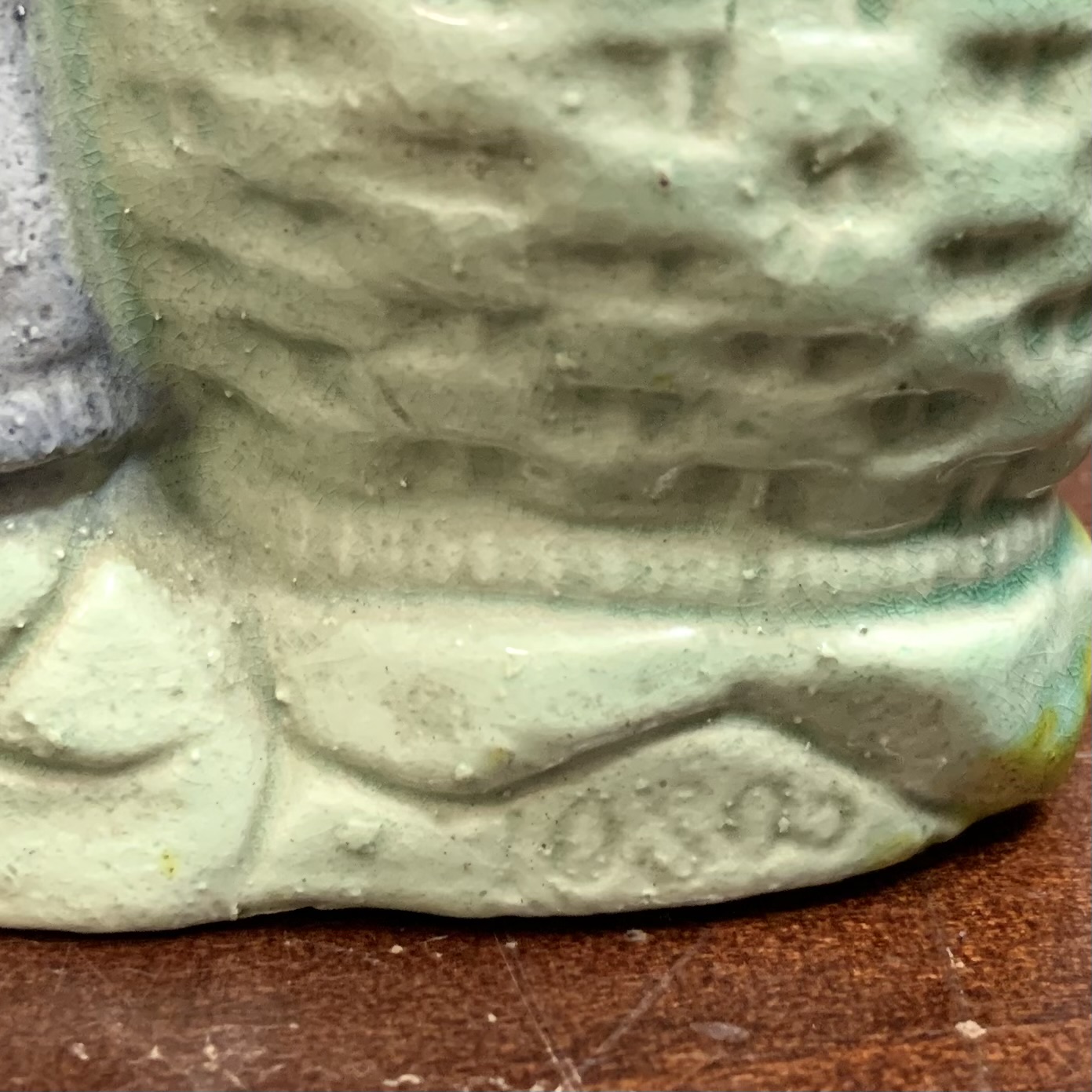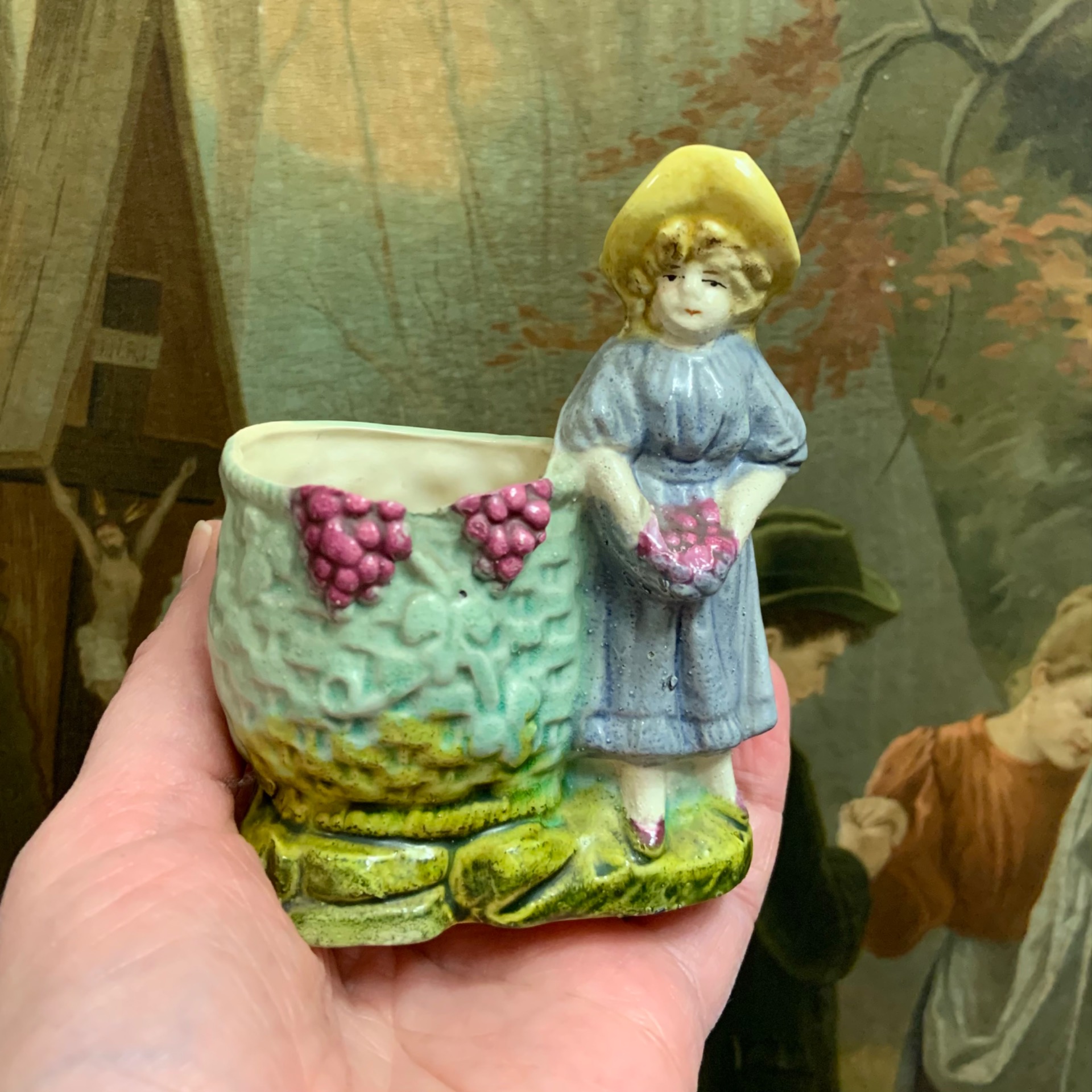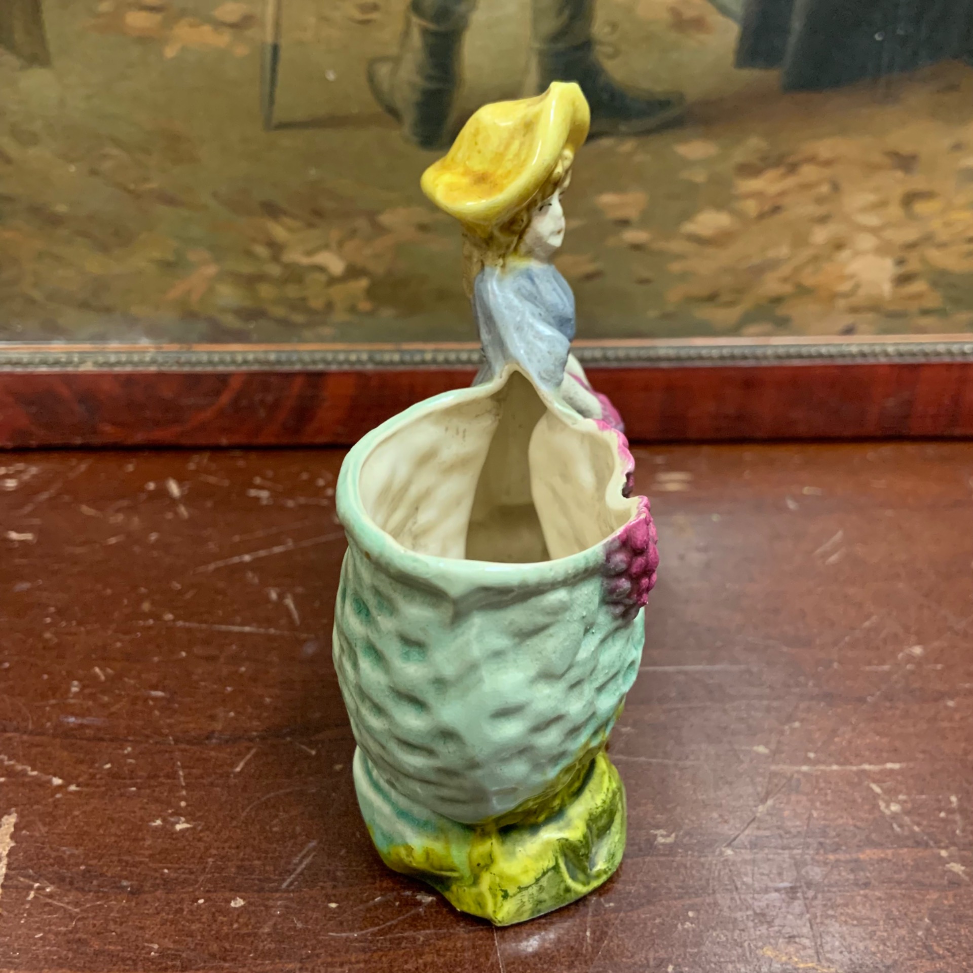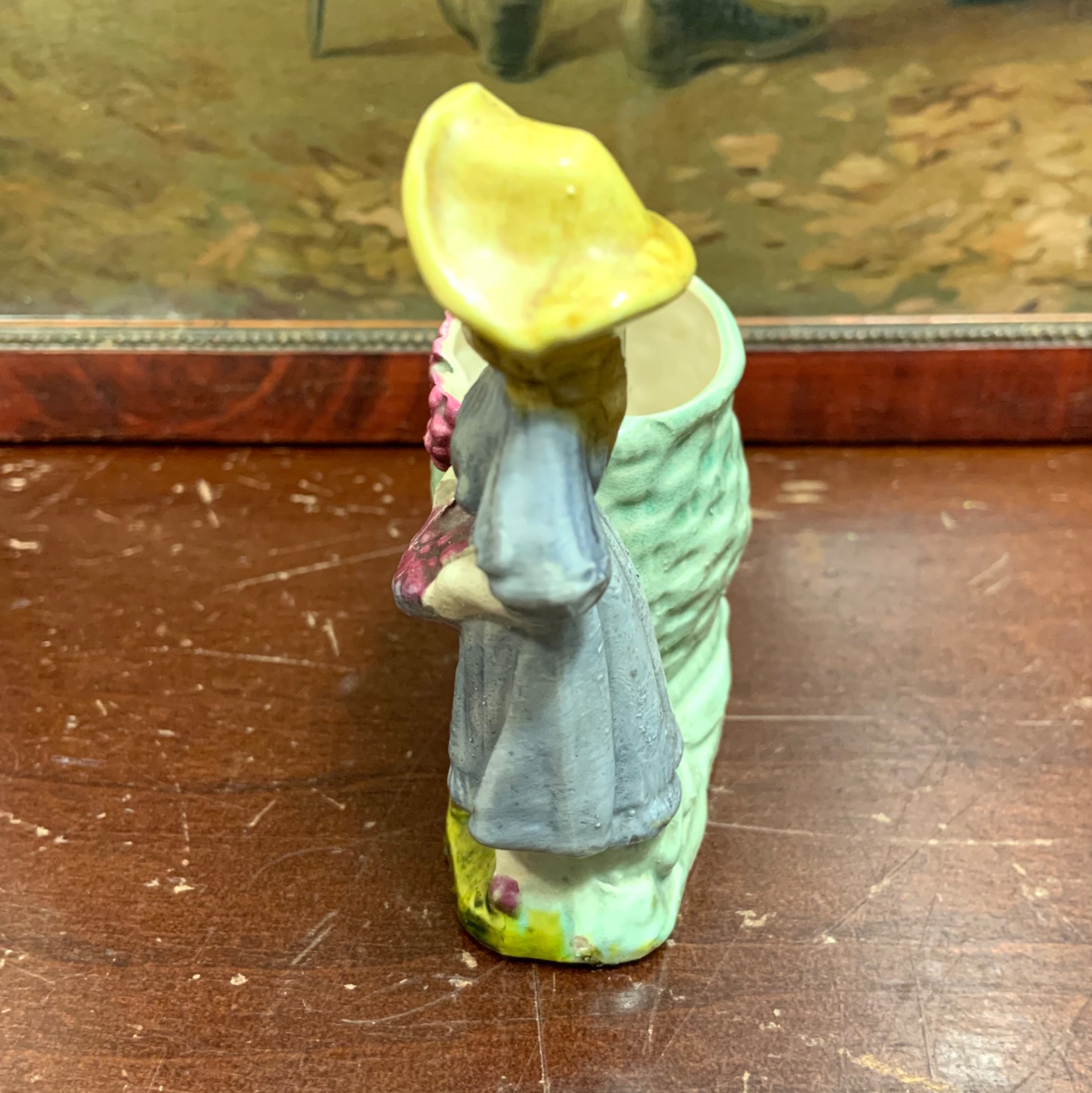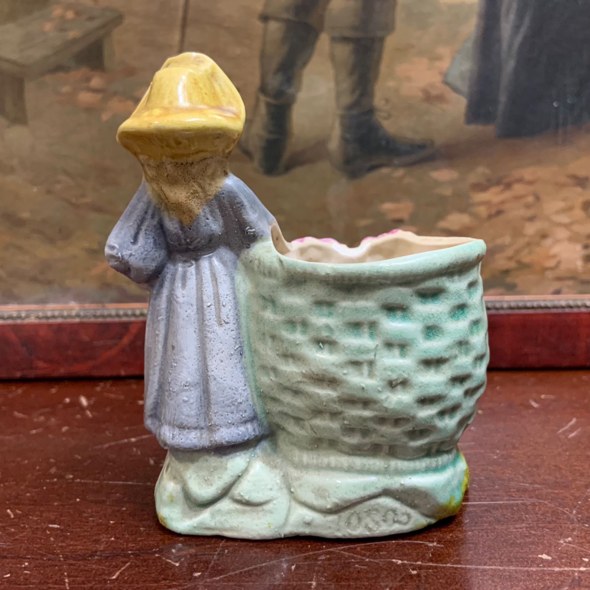 Pieni figuriini koristeruukku. Ikäarvio 1900 luvun alkupuoli. Korkeus 9,5 cm., 7,5 x 4 cm.