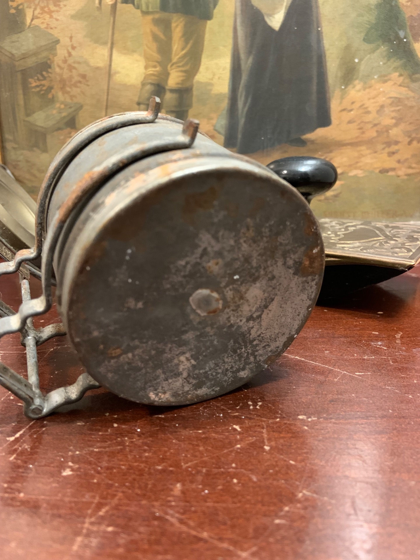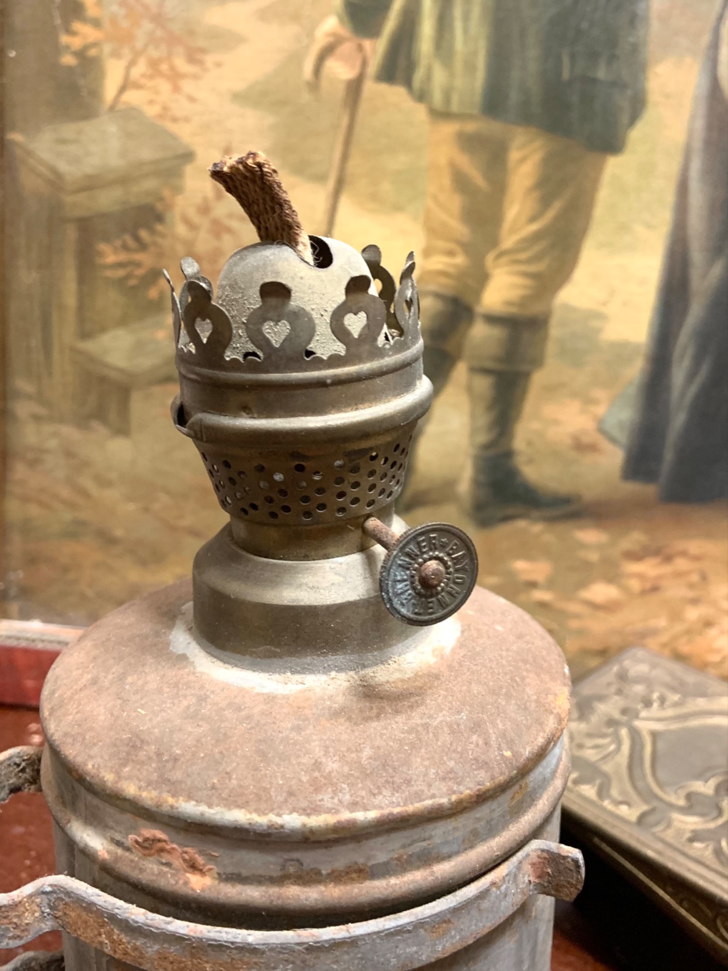 Vanha metallinen öljylamppu. Säätöpyörä pyörii nihkeästi. Sydänlanka on.