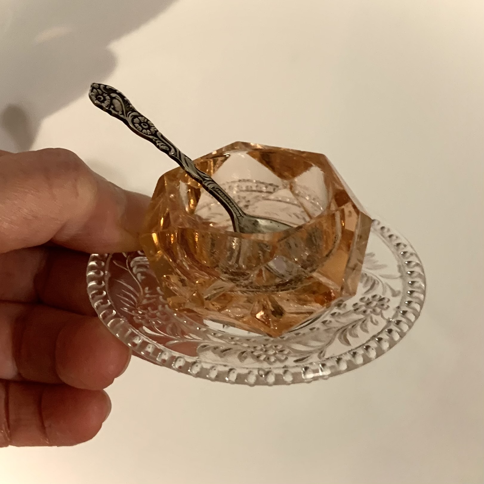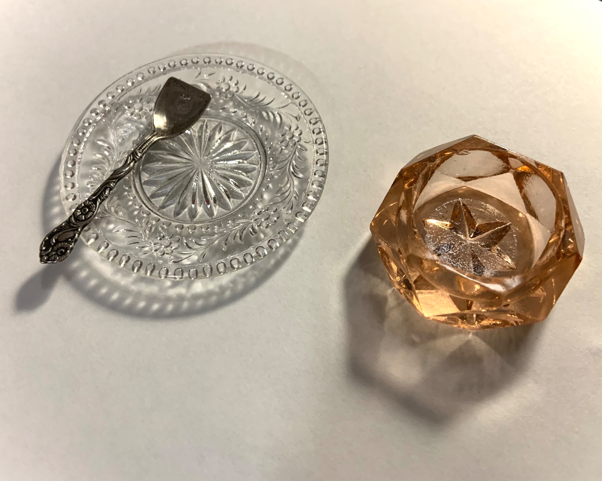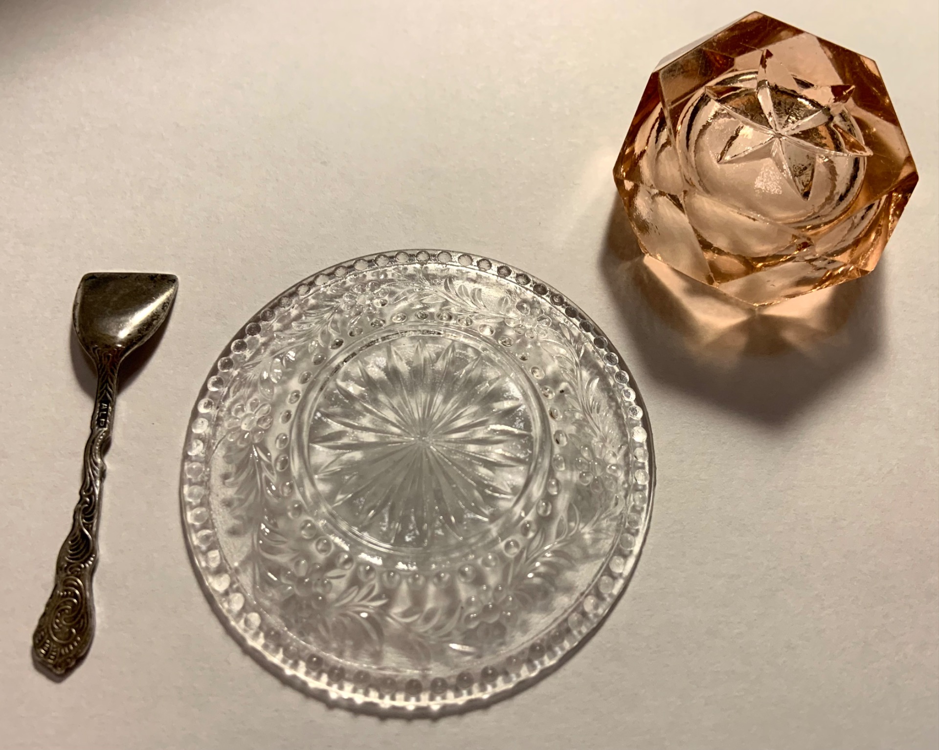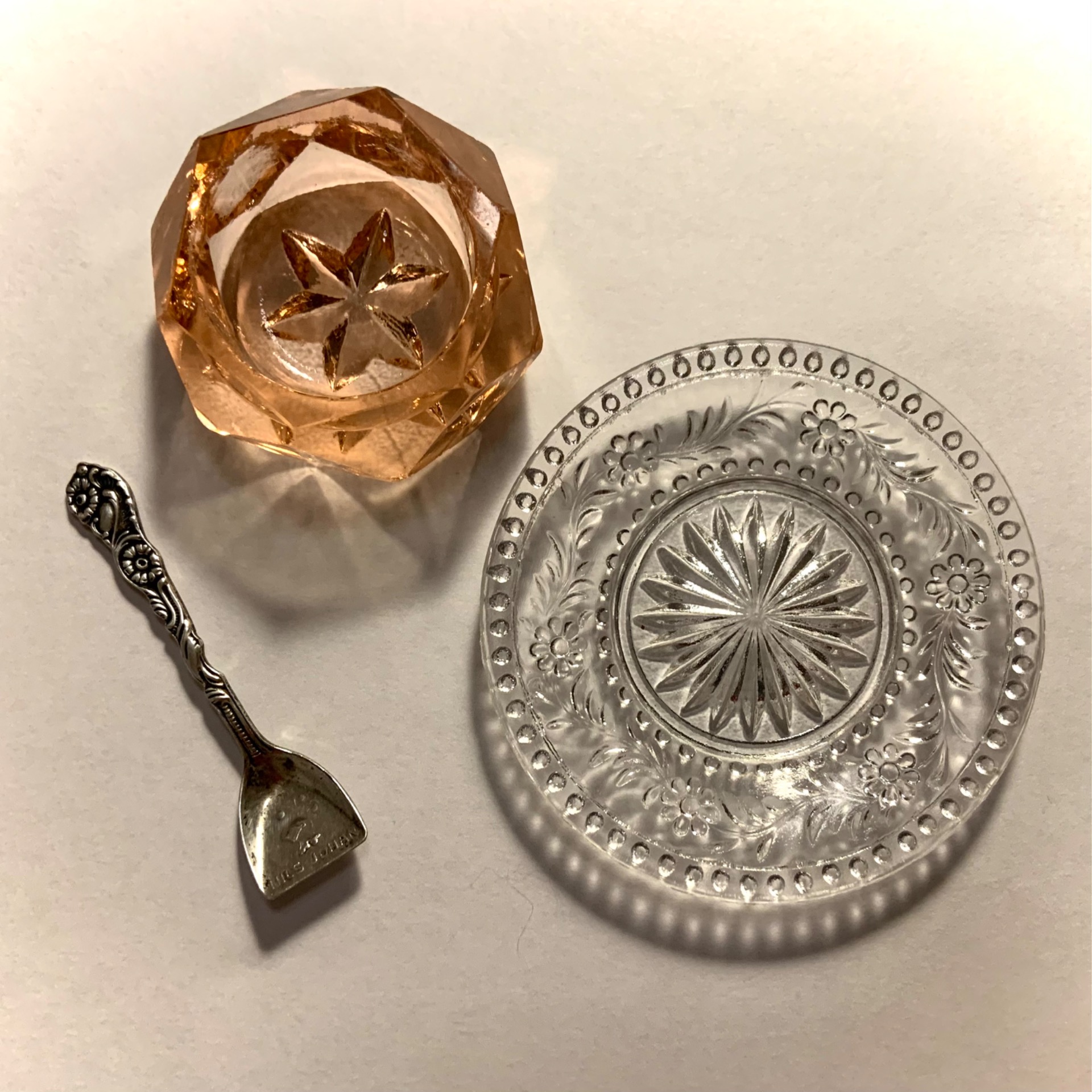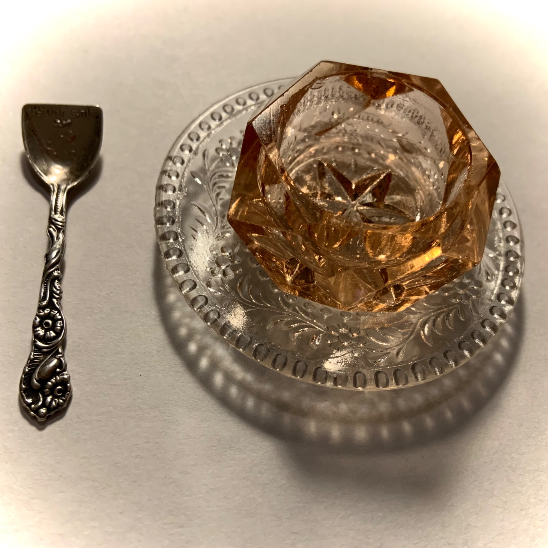 Erikoisemman värinen suolakuppi. Pikkuinen Nils Johan suolalusikka ja pieni lautanen. Pientä kokoa kaikki.