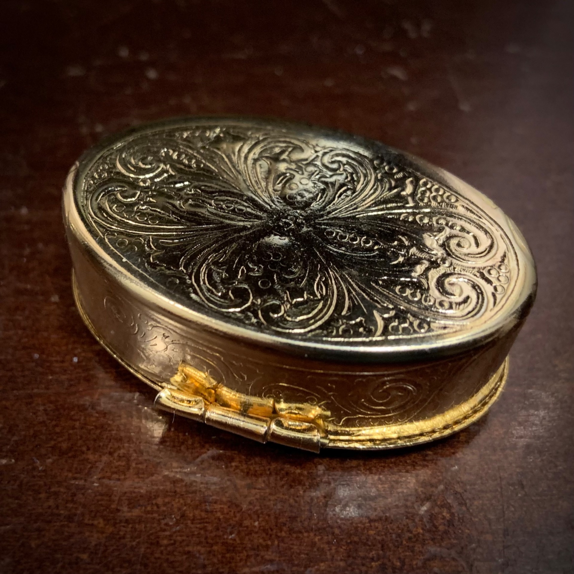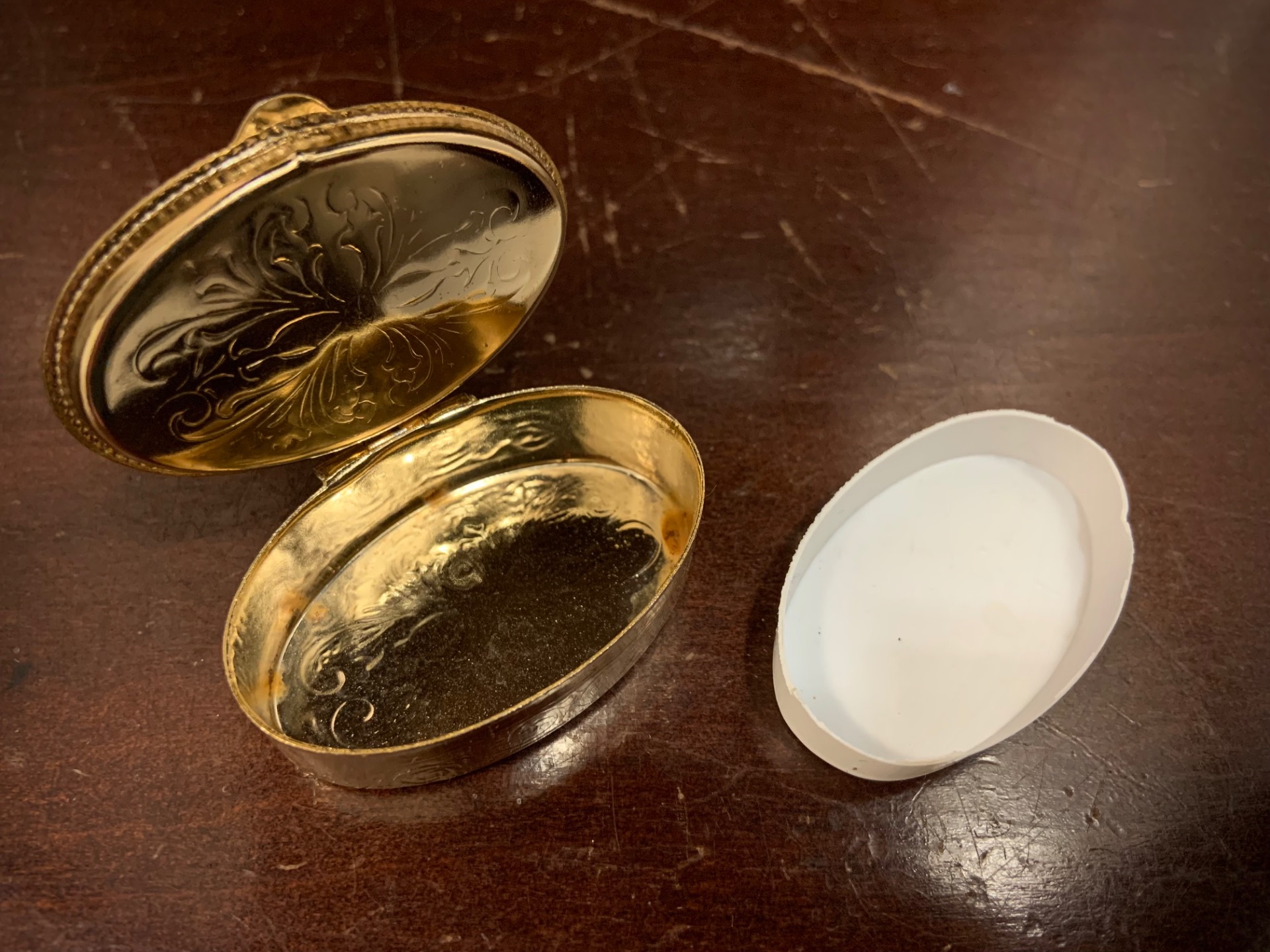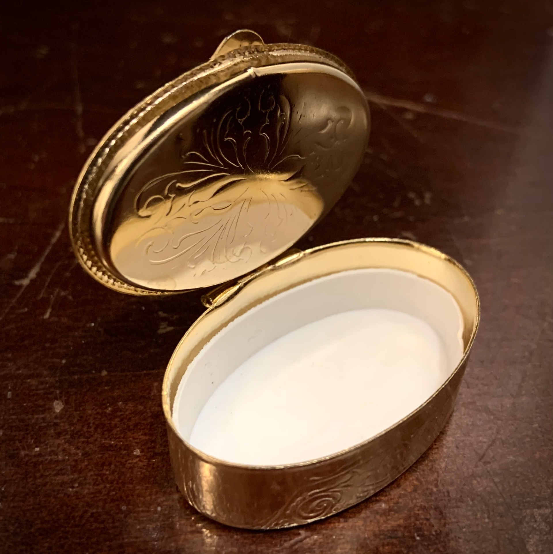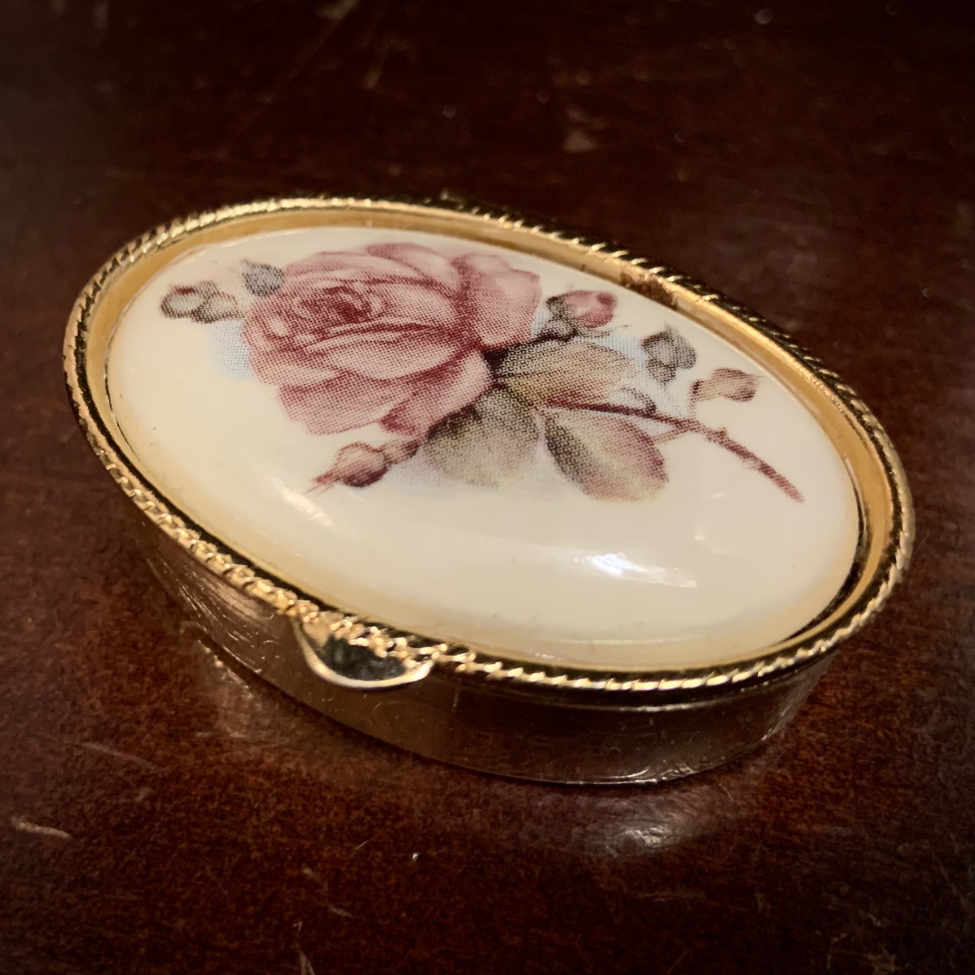 Kaunis pillerirasia. 5 x 3,7 x 1,7 cm. Sisällä ohut muovinen irroitettava osa. Kansi jämäkkä ja aukeaa ja sulkeutuu hyvin. Ruusuaihe.