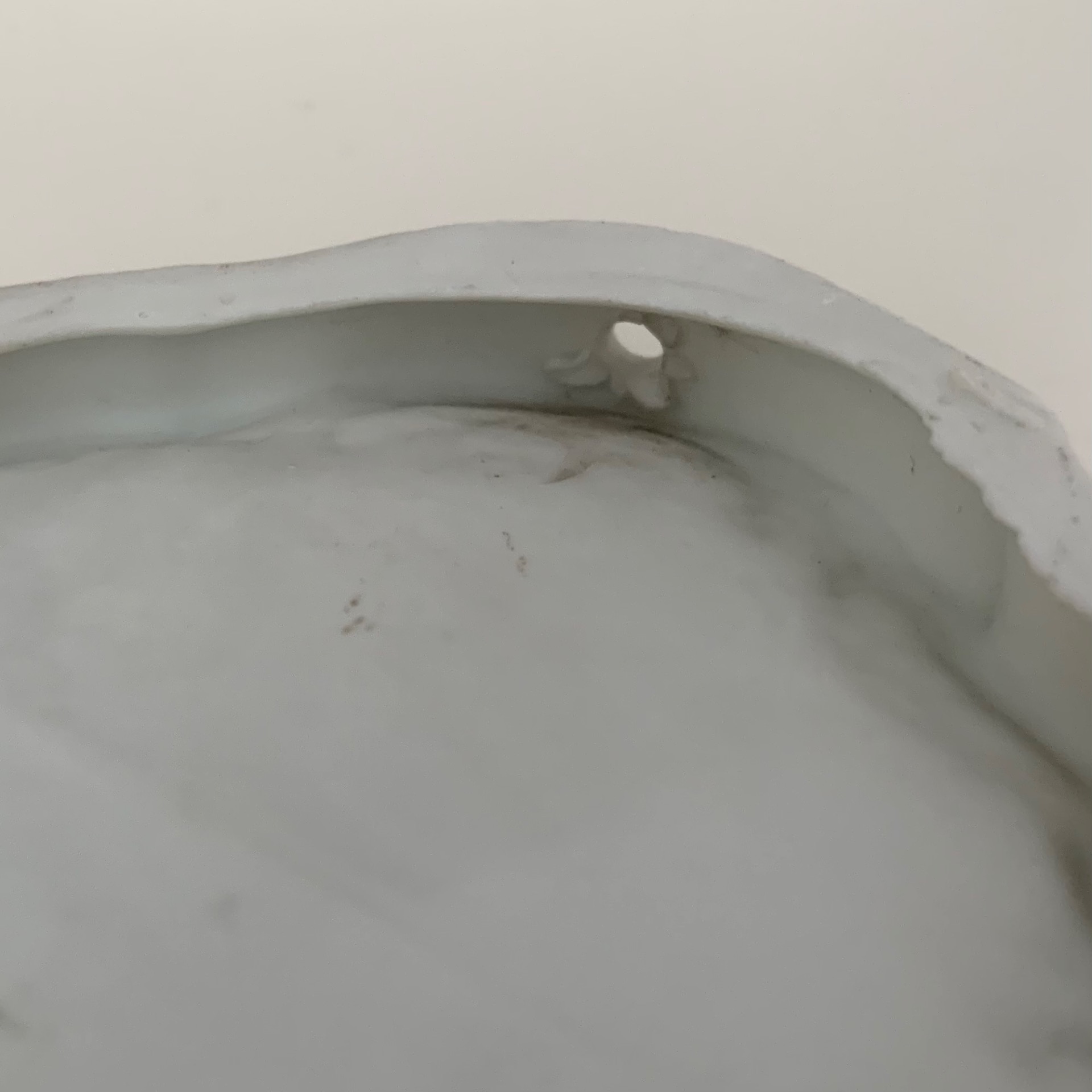 Posliininen seinäkoriste. Taustan yläosassa pieni reikä, josta saa ripustettua koukkuun tai laitettua narun / rautalankalenkin.